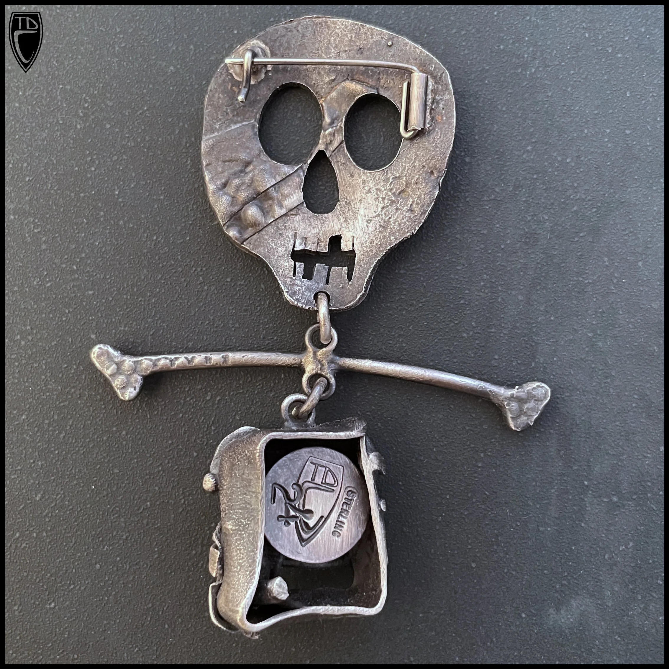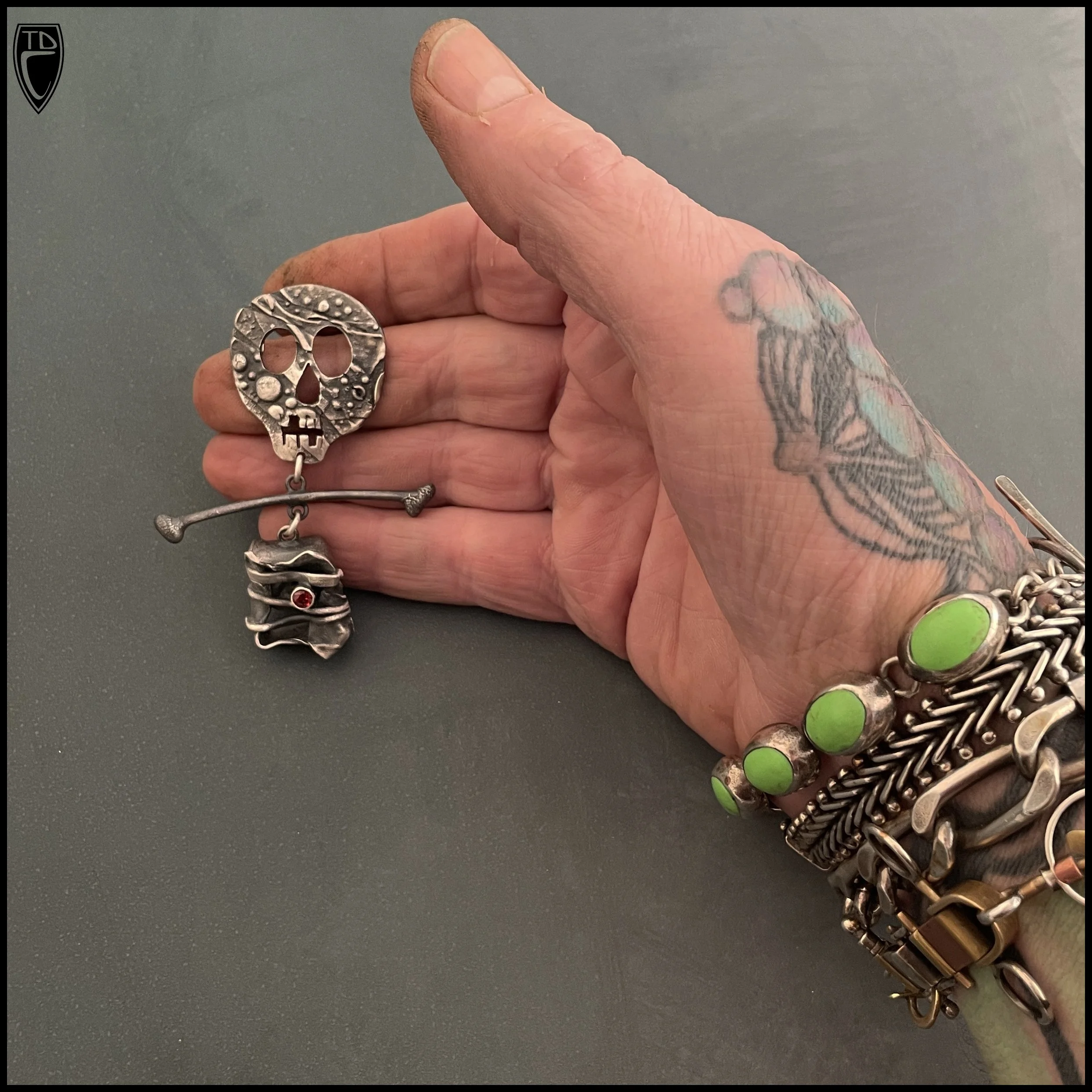 This listing is for the one brooch with the single bone. Highly textural fused and reticulated sterling silver skull, bone and abstract ribcage brooch with a tube set 4mm faceted garnet. The composition is joined at each juncture and is kinetic when worn. The brooch is worn using the handmade sterling silver and 18 gauge spring steel mechanism and this lightweight piece is signed and hallmarked. The brooch measures approximately 2.75×3”. Complimentary tracked and insured USPS ground Advantage shipping within the US.