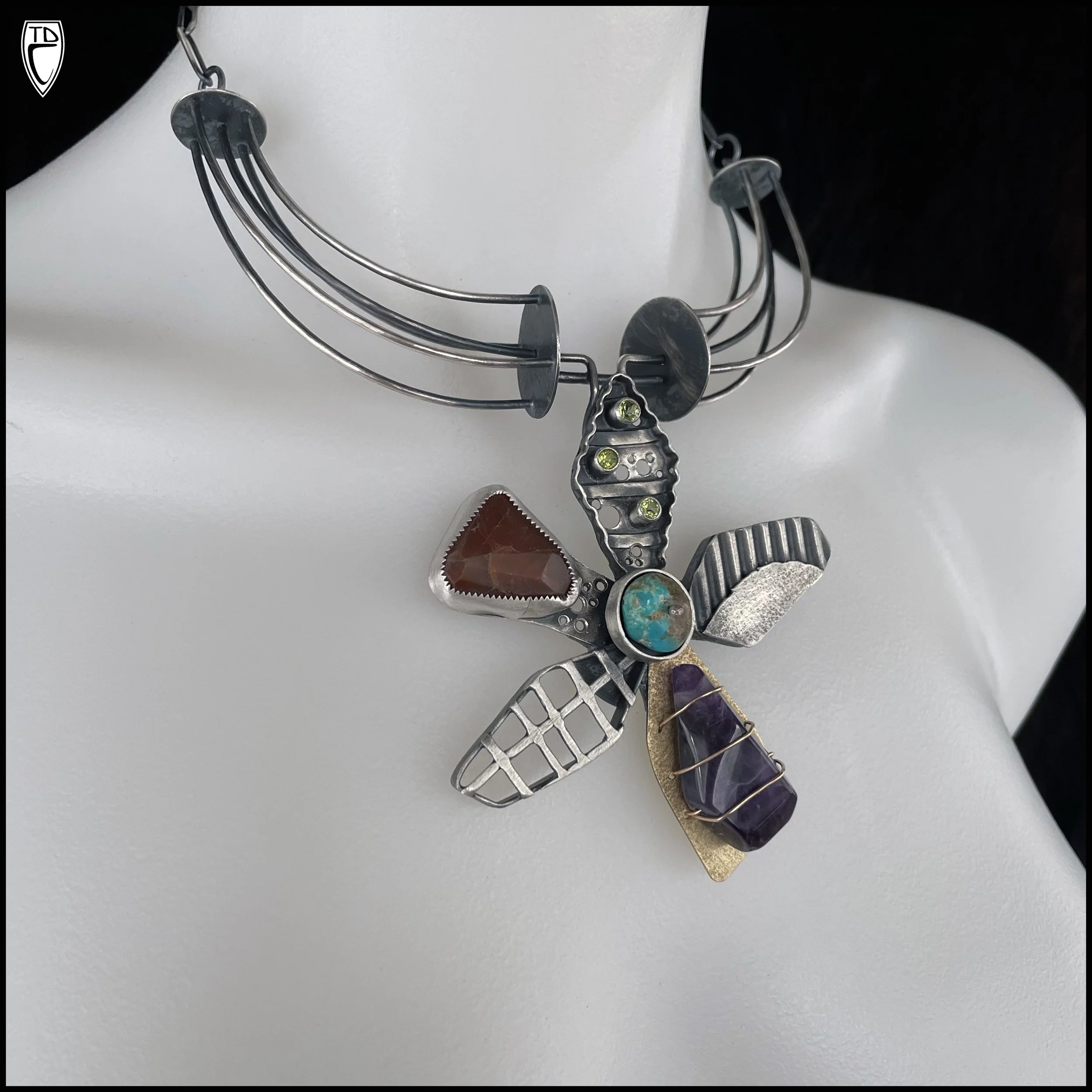 A naive flower pendant of textural sterling silver, brass, bronze, turquoise, amethyst, peridot and carnelian is kinetically suspended from caged sterling silver three dimensional elements and handmade paperclip chain. The flower measures approximately 3.25” in diameter and the piece is adjustable from 15.5-18.5”. Signed, hallmarked and dated 2025. Flat rate insured and tracked USPS Ground Advantage shipping or USPS Priority shipping within the US. International shipping prices vary.