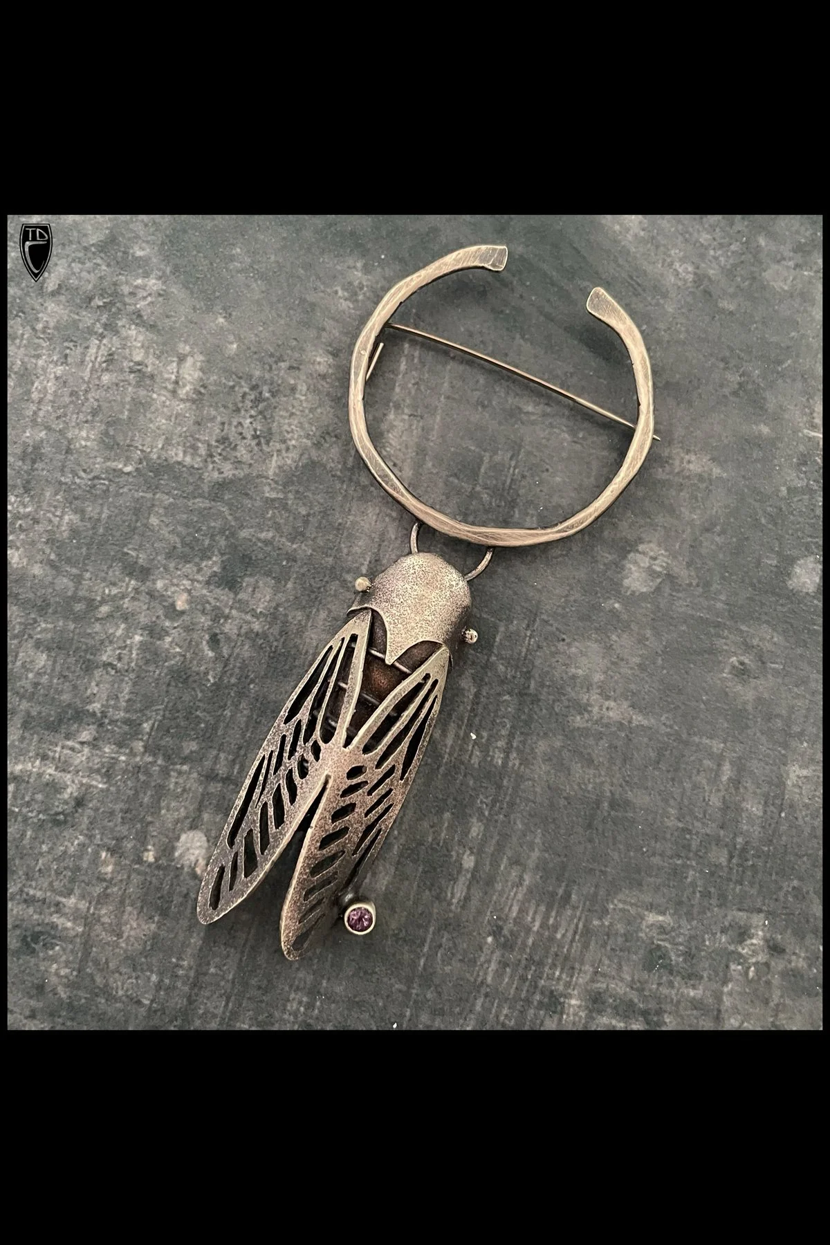 This kinetic cicada is completely hand constructed from textured, pierced and smooth sterling silver and copper and suspends from a forged sterling silver ring. The wing has a solitary 4mm tube set faceted amethyst. The piece is finished with a patina to highlight the details and is worn as a brooch using the handmade sterling silver and 18 gauge spring steel mechanism. This lightweight and kinetic piece measures approximately 4×1.25”. Flat rate insured and tracked USPS Ground Advantage shipping or USPS Priority shipping within the US. International shipping prices vary.