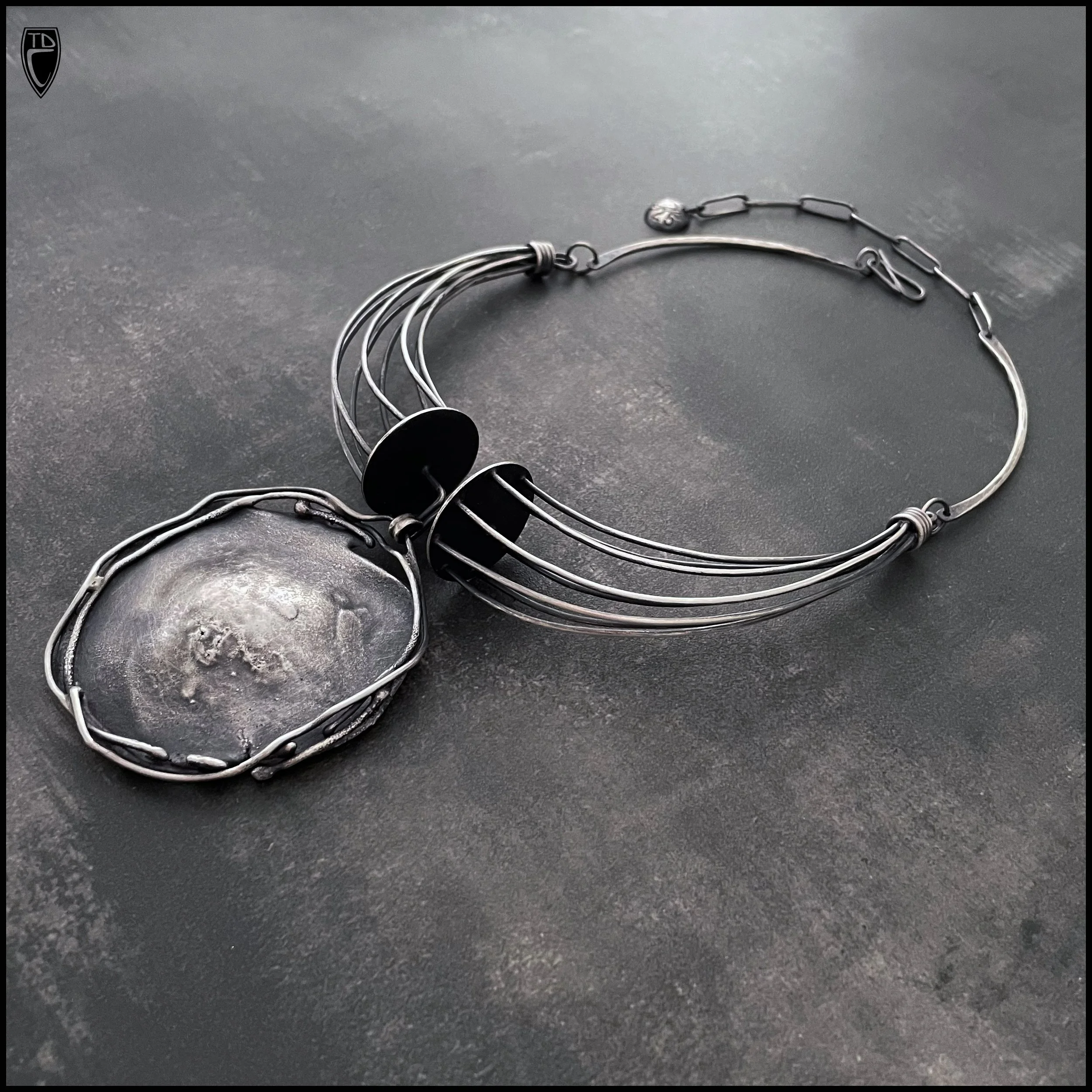 A pendant of hammered and domed textural “raw” sterling silver is naively framed with sterling silver wire and kinetically suspended from caged sterling silver three dimensional elements and forged sterling silver. The piece closes in back with a forged hook and handmade paperclip chain. The sterling disc measures approximately 2.5” in diameter and the piece is adjustable from 15.5-18.5”. Signed, hallmarked and dated 2025. Flat rate insured and tracked USPS Ground Advantage shipping or USPS Priority shipping within the US. International shipping prices vary.