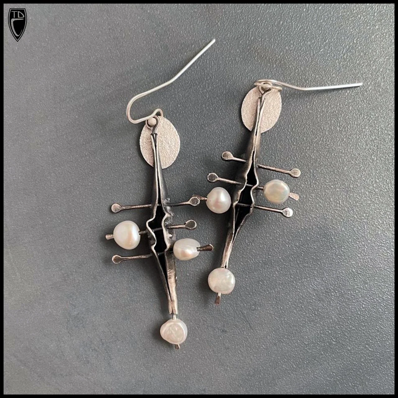A hand fabricated and textural three dimensional open pod is pierced with wire which contains captured freshwater pearls. These extremely lightweight earrings measure 2.25" from bottom of hand made sterling silver 20 gauge ear wire, .75" wide and weigh 6 grams each. Complimentary tracked and insured USPS Ground Advantage shipping within the US.