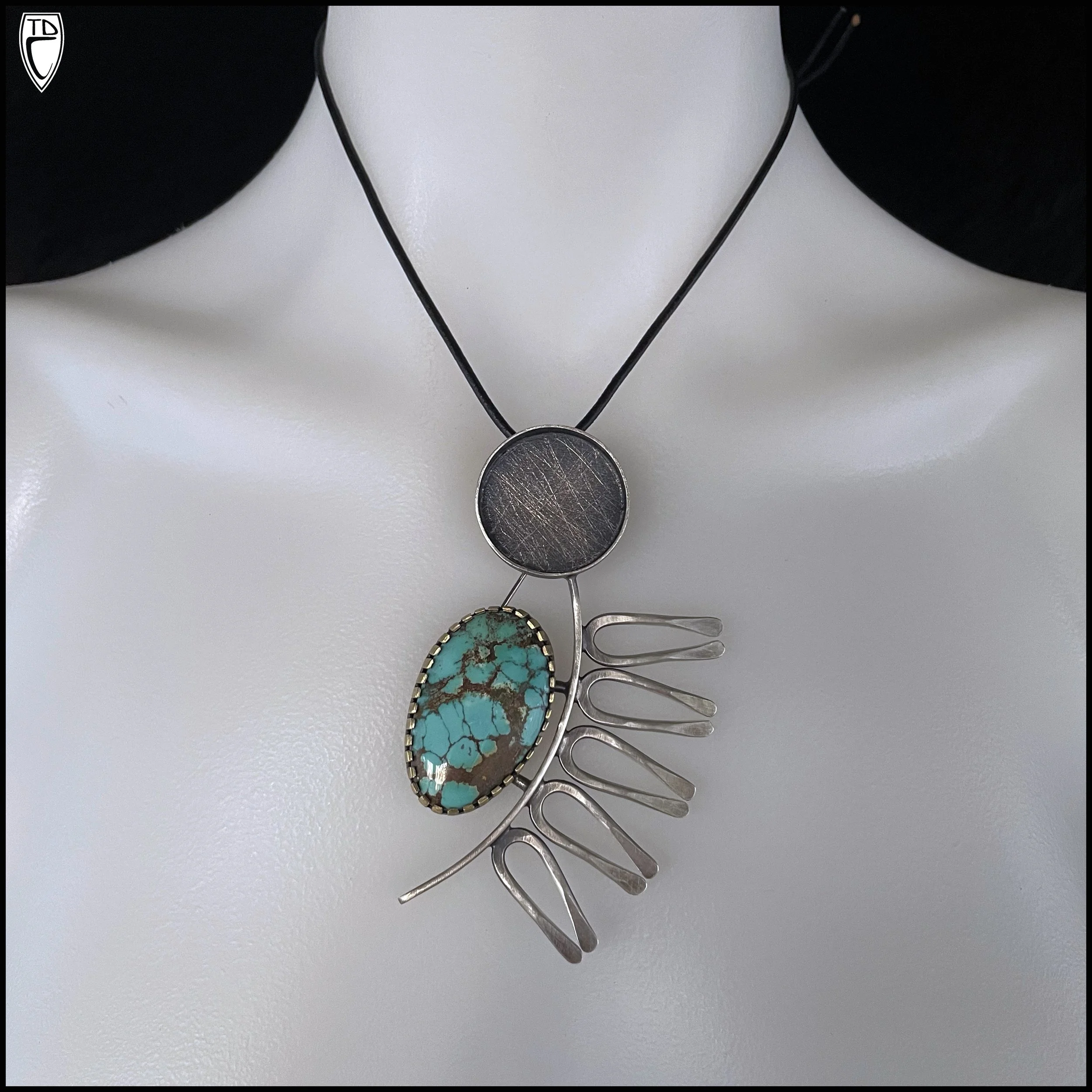 This one of a kind brooch is created from hammer forged and fabricated sterling silver with a “leaf” of brass bezel set turquoise. The central curved spine supports a bezel and scratch finished patinated flower head. The piece is finished with a patina to highlight the detail and is worn as a brooch using the handmade sterling silver and 18 gauge spring steel mechanism and as a pendant with the integrated hidden bale. This lightweight piece measures approximately 3.5×2.25” and is signed, hallmarked and dated 2025. Flat rate insured and tracked USPS Ground Advantage shipping or USPS Priority shipping within the US. International shipping prices vary.