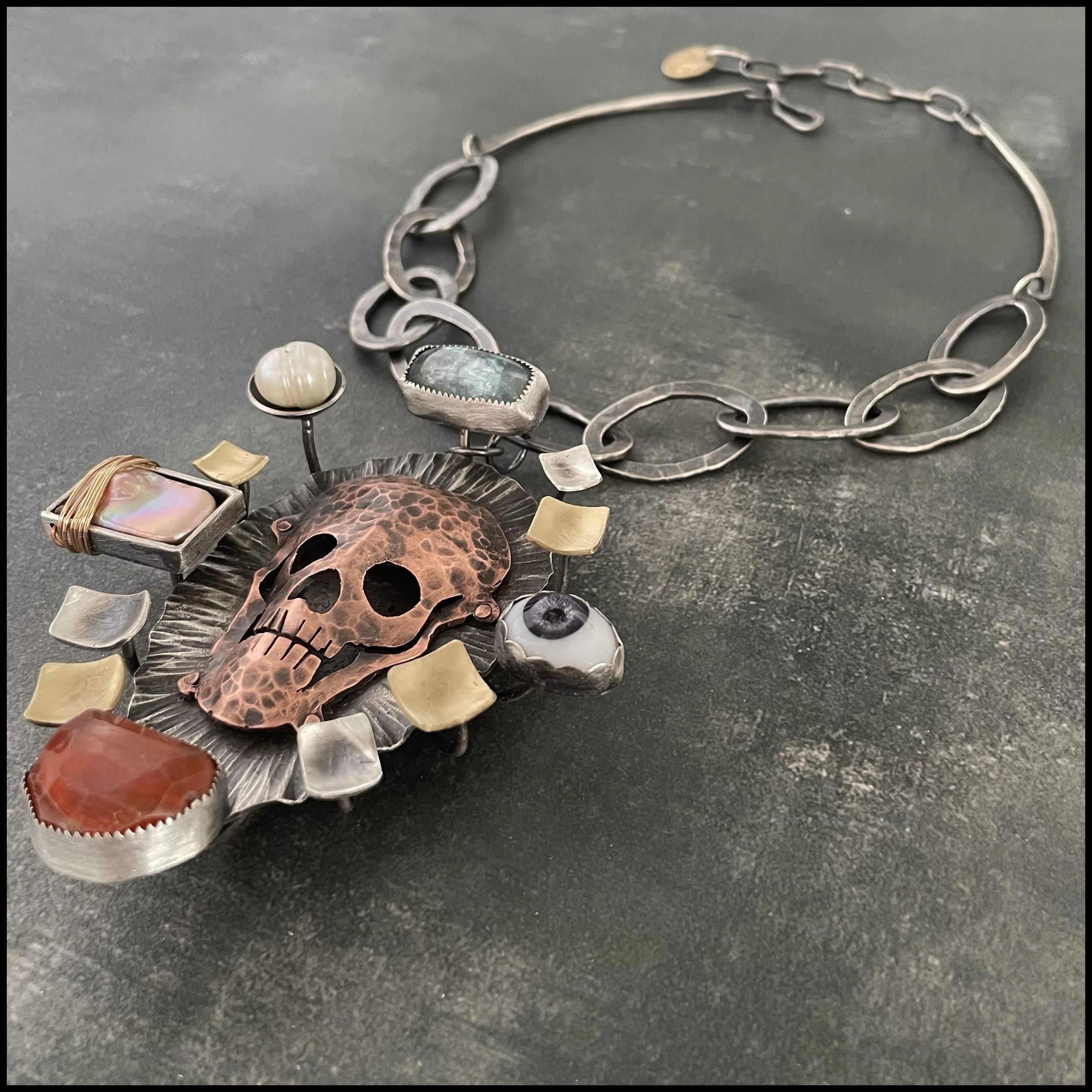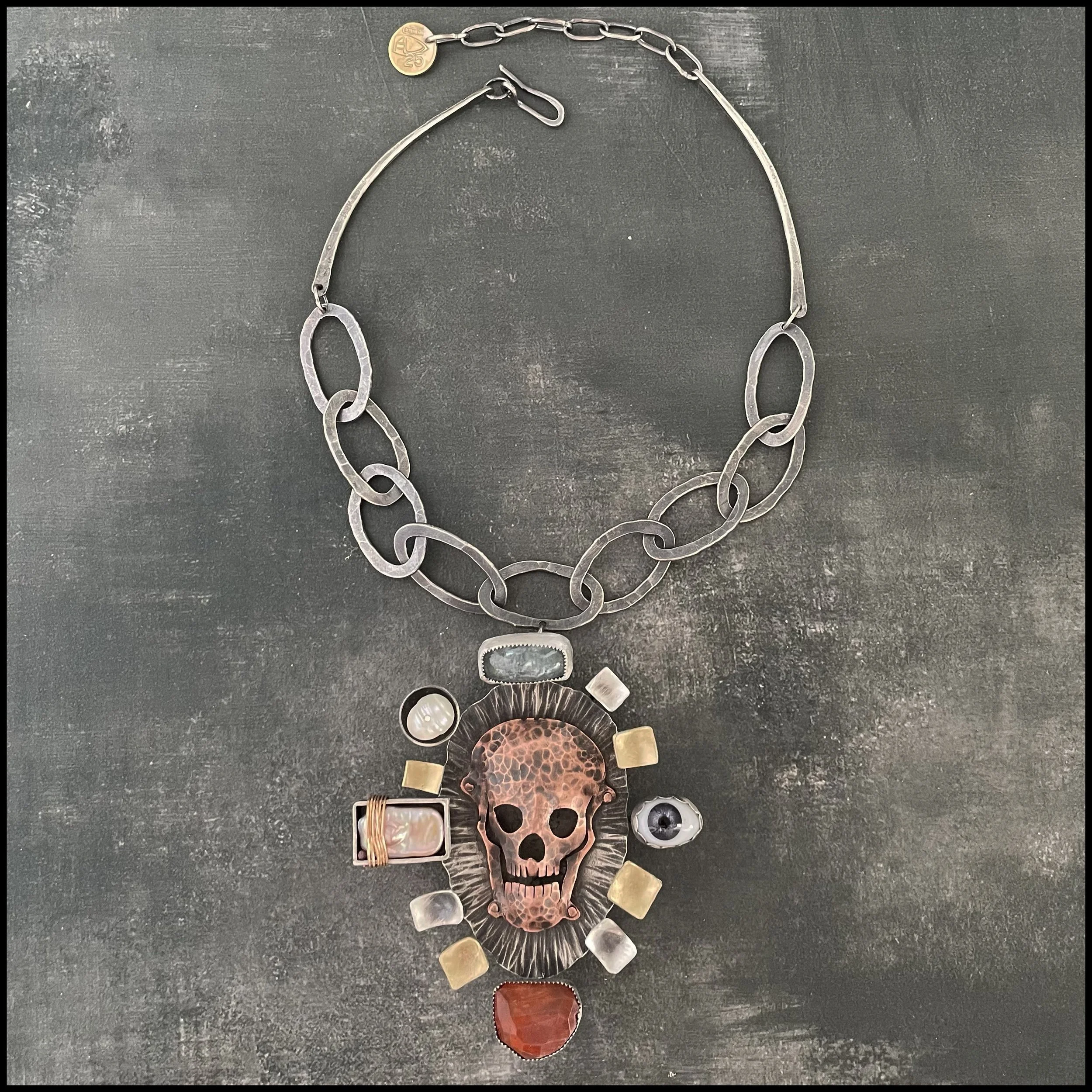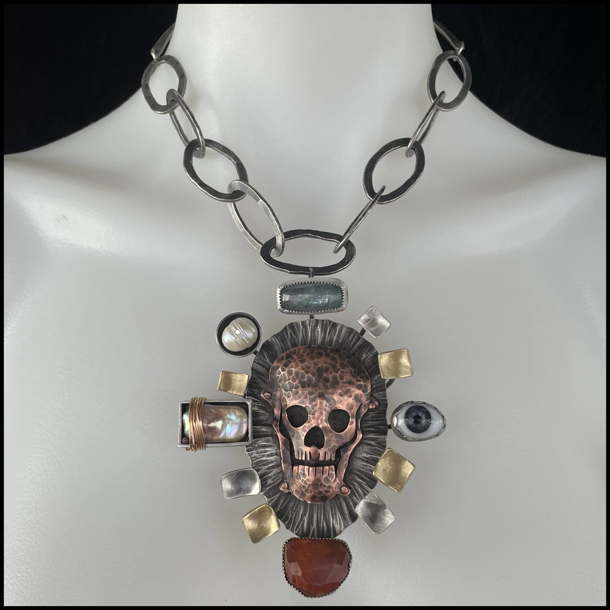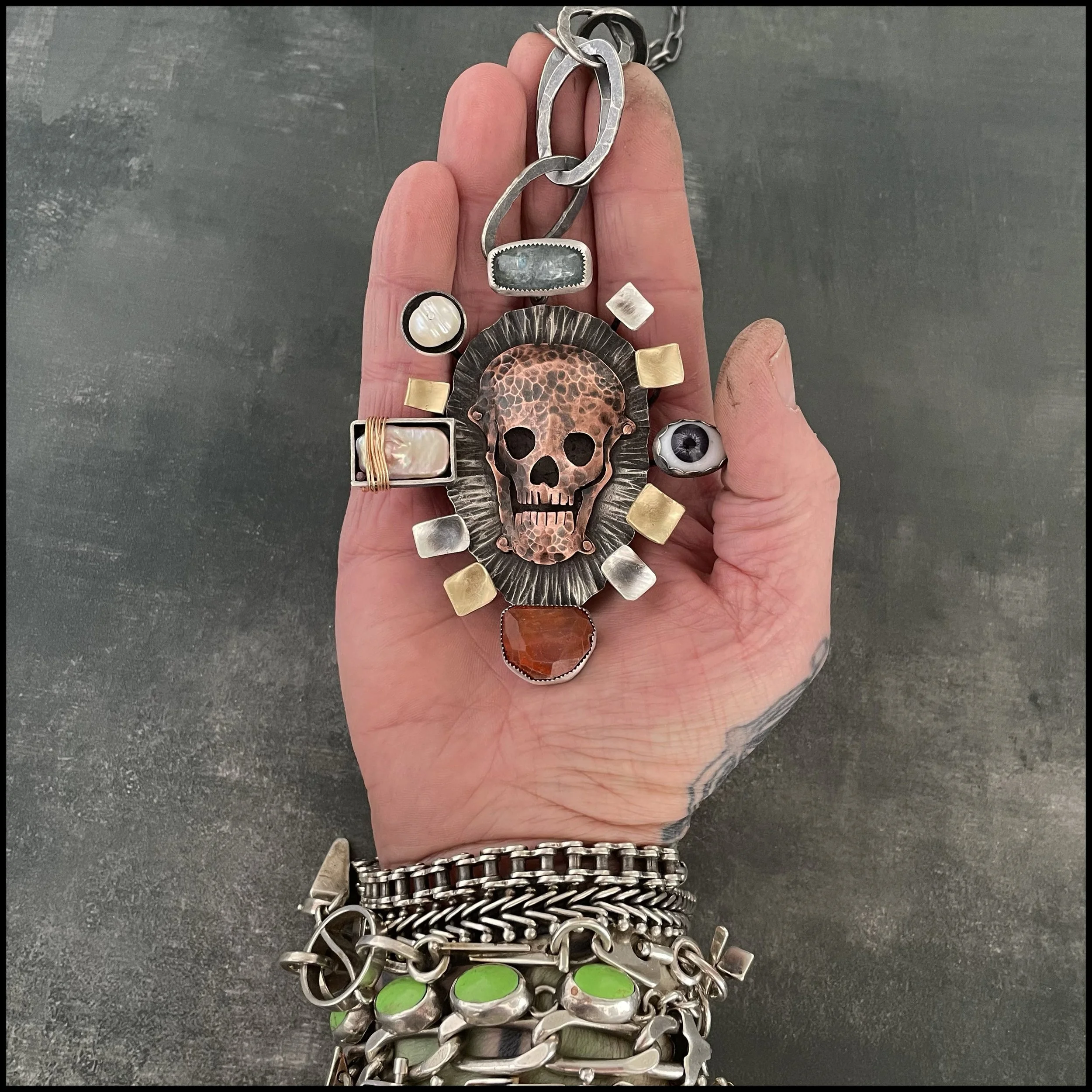 “Talisman”, is created from forged, hammered and fabricated solid sterling silver, copper and brass with a bronze wire wrapped pearl element. The piece features a hand formed and hammer raised copper skull as the central element with an “explosion” of elements that surrounds it, including two pearls, a carnelian, a blue kyanite and an antique solid glass doll’s eye. The piece is finished with a patina and is worn using the handmade sterling silver heavy gauge organic link chain and forged neck piece. The pendant measures approximately 4×3,5”, the chain is adjustable from 15.5-19” and the entire piece weighs 122 grams. Signed, hallmarked and dated 2025. Flat rate insured and tracked USPS Ground Advantage shipping or USPS Priority shipping within the US. International shipping prices vary.