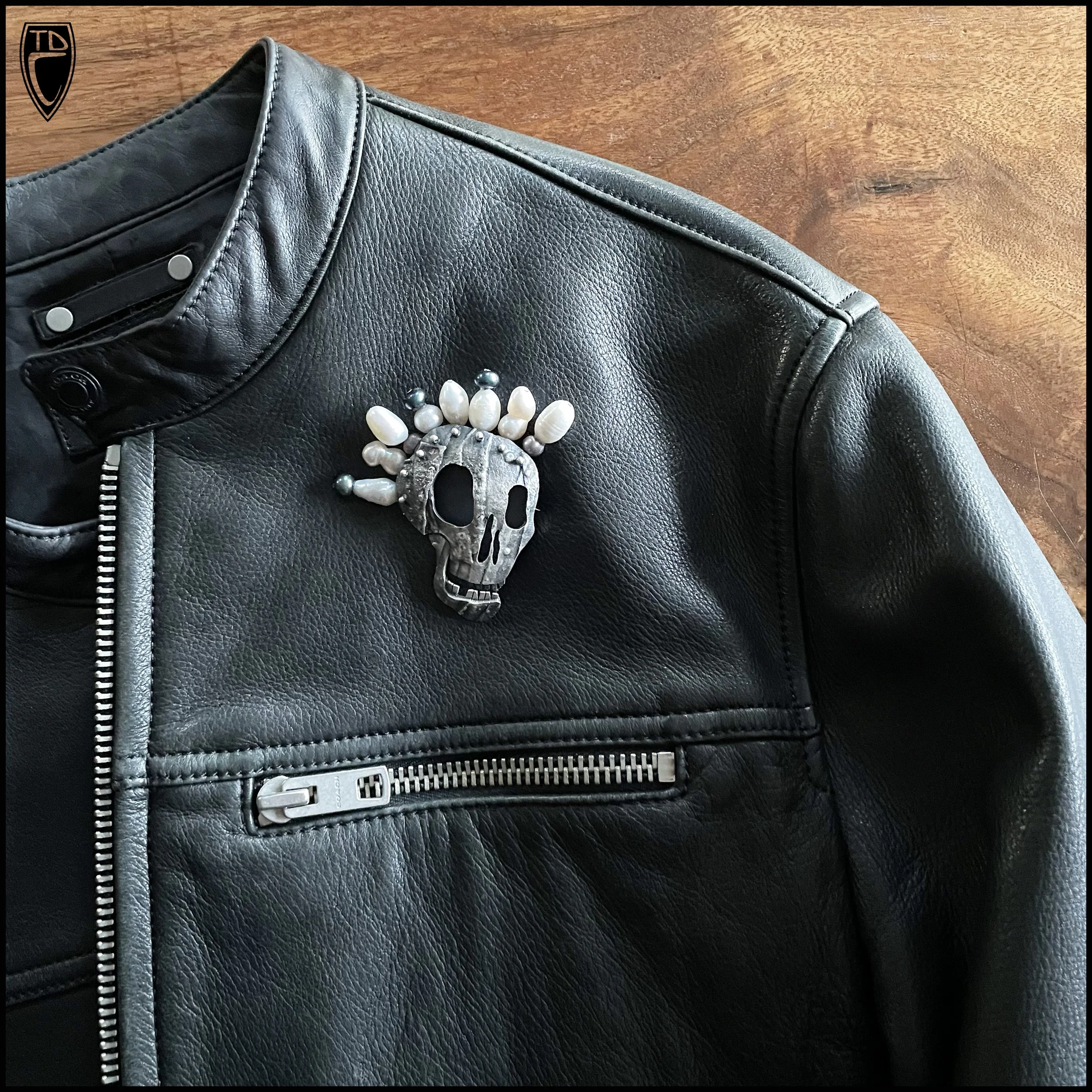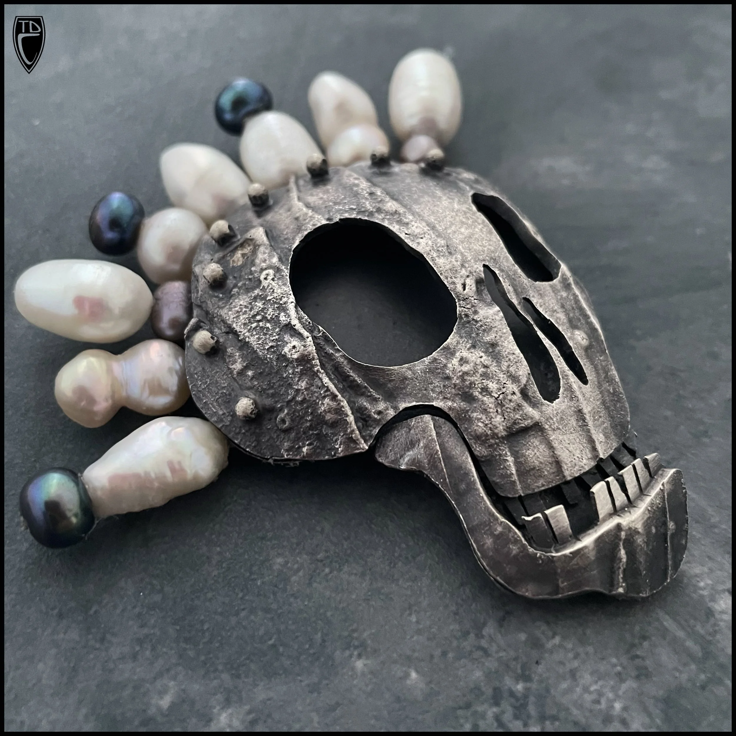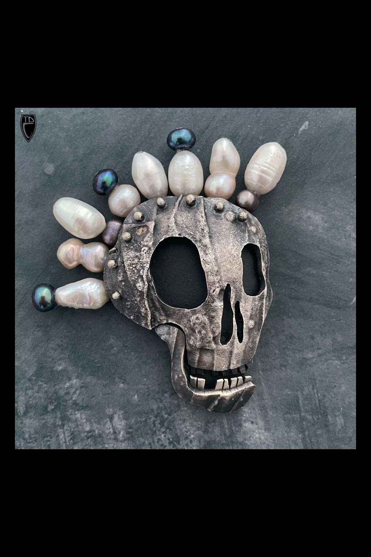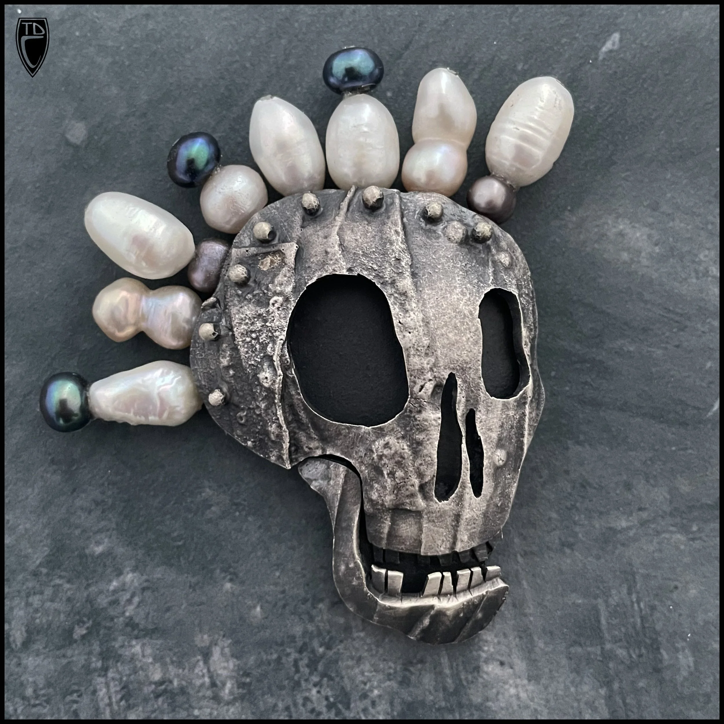 “Pearl” is one of a kind profile skull form which is created from hollow formed and pierced highly textural sterling silver that is framed with 13 post set pearls. The piece is finished with a patina to highlight the detail and is worn as a brooch using the handmade sterling silver and 18 gauge spring steel mechanism. This lightweight piece measures approximately 2.5×2.5” and is signed, hallmarked and dated 2025. Flat rate insured and tracked USPS Ground Advantage shipping or USPS Priority shipping within the US. International shipping prices vary.
